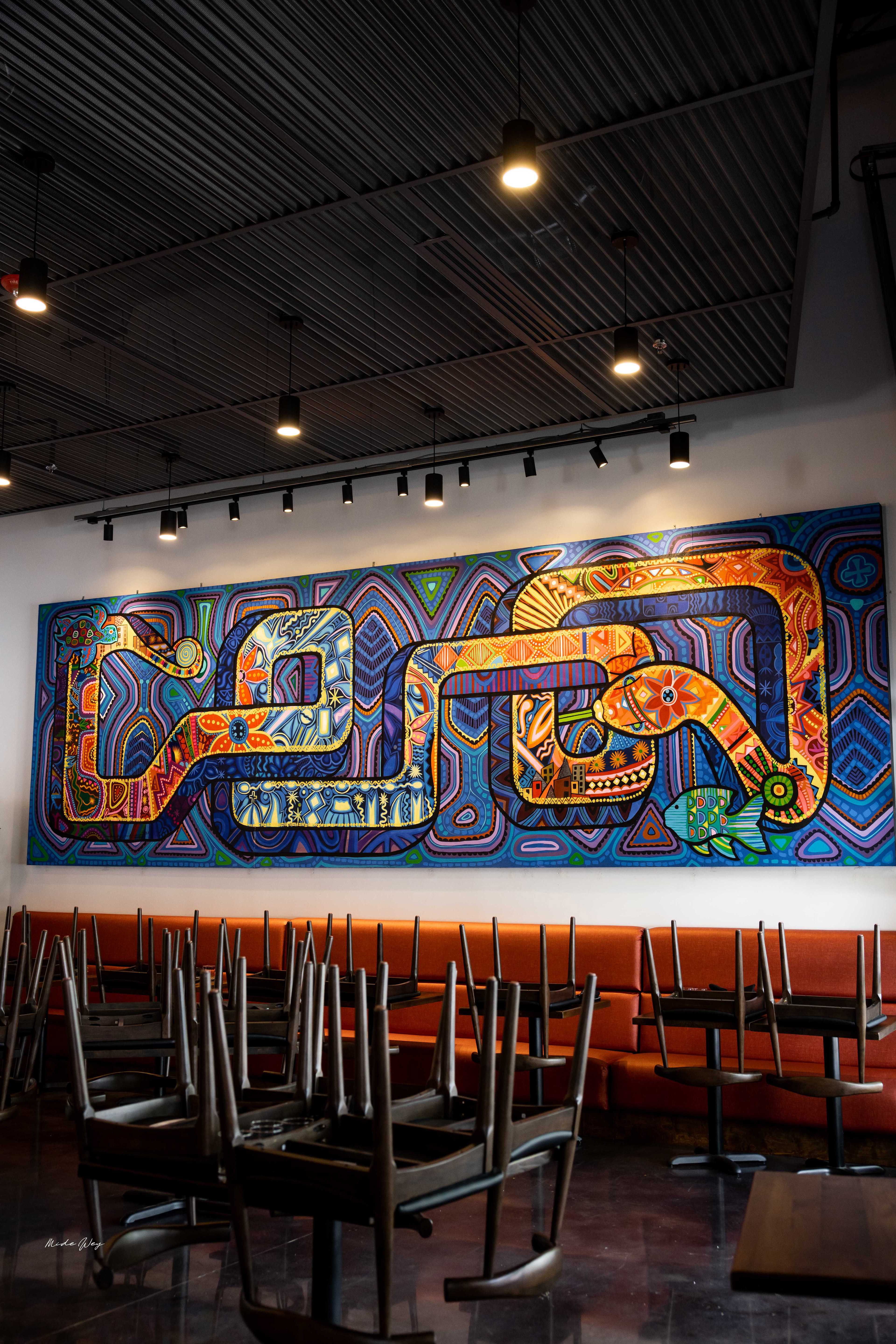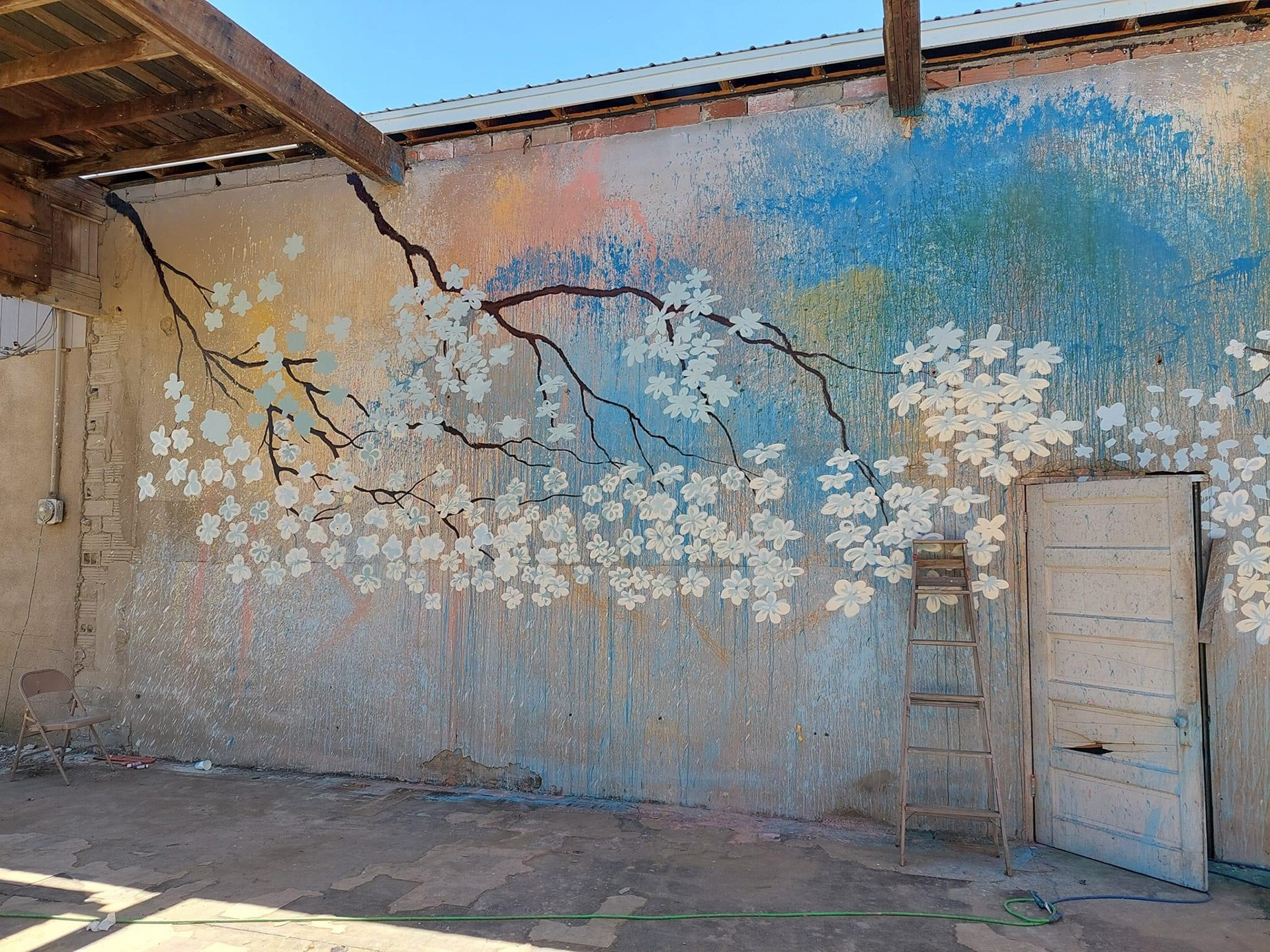 Mural paint on concrete wall, 40ft x 15ft, 2022